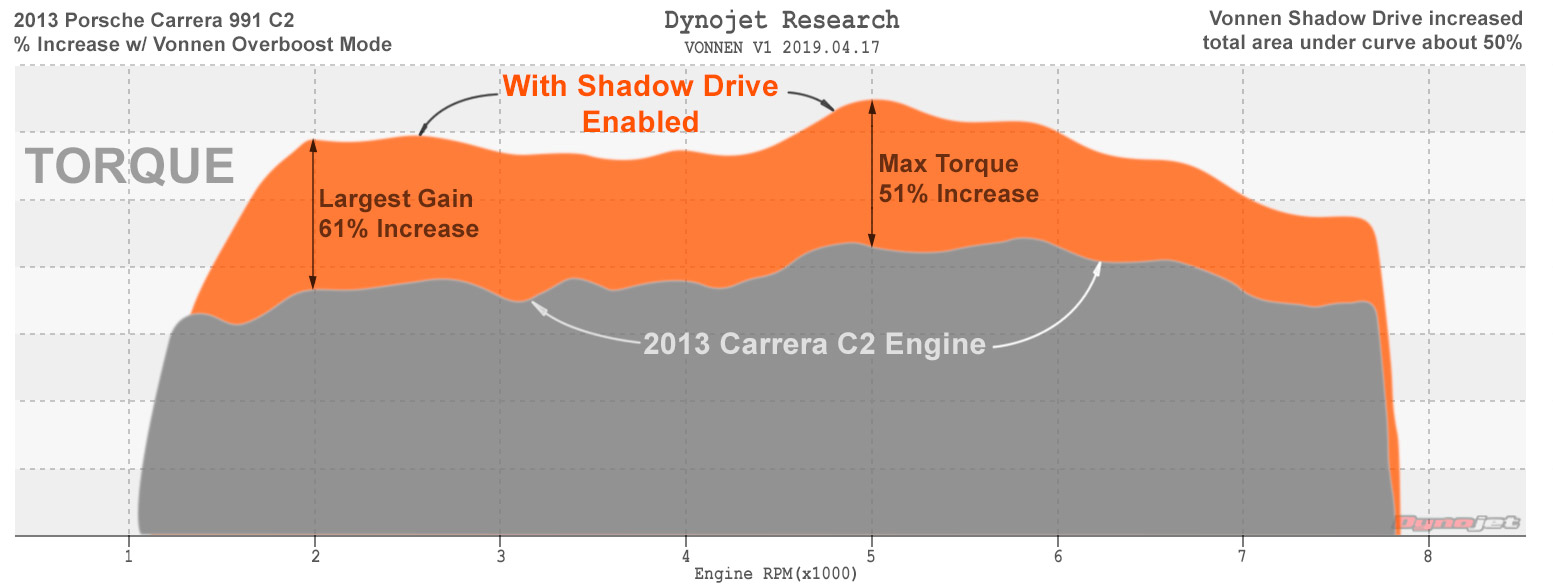 VSD supports a range of Porsche models with varying stock engine power output, in all cases the Vonnen addition is the same. The combined performance potential therefore varies.